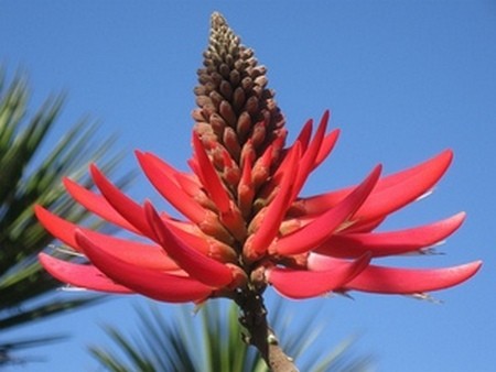 Erythrina coralloides also known as the Flame Coral Tree is a species of flowering tree in the pea family or Fabaceae, ranges from the American state of Arizona to the Oaxaca in Mexico. The plant with its hard, red pointed ‘petals’ looks like misplaced coral growing up in the middle of sparse vegetation or desert.