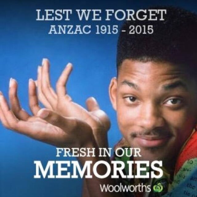 On the Anzac memorial holiday Woolworth’s invited Australian and New Zealand customers to honor those who died in combat while also promoting the store’s fresh offerings by submitting an image of someone they wanted to honor to accompany the above text. This was so disastrous that the campaign was pulled in three hours.